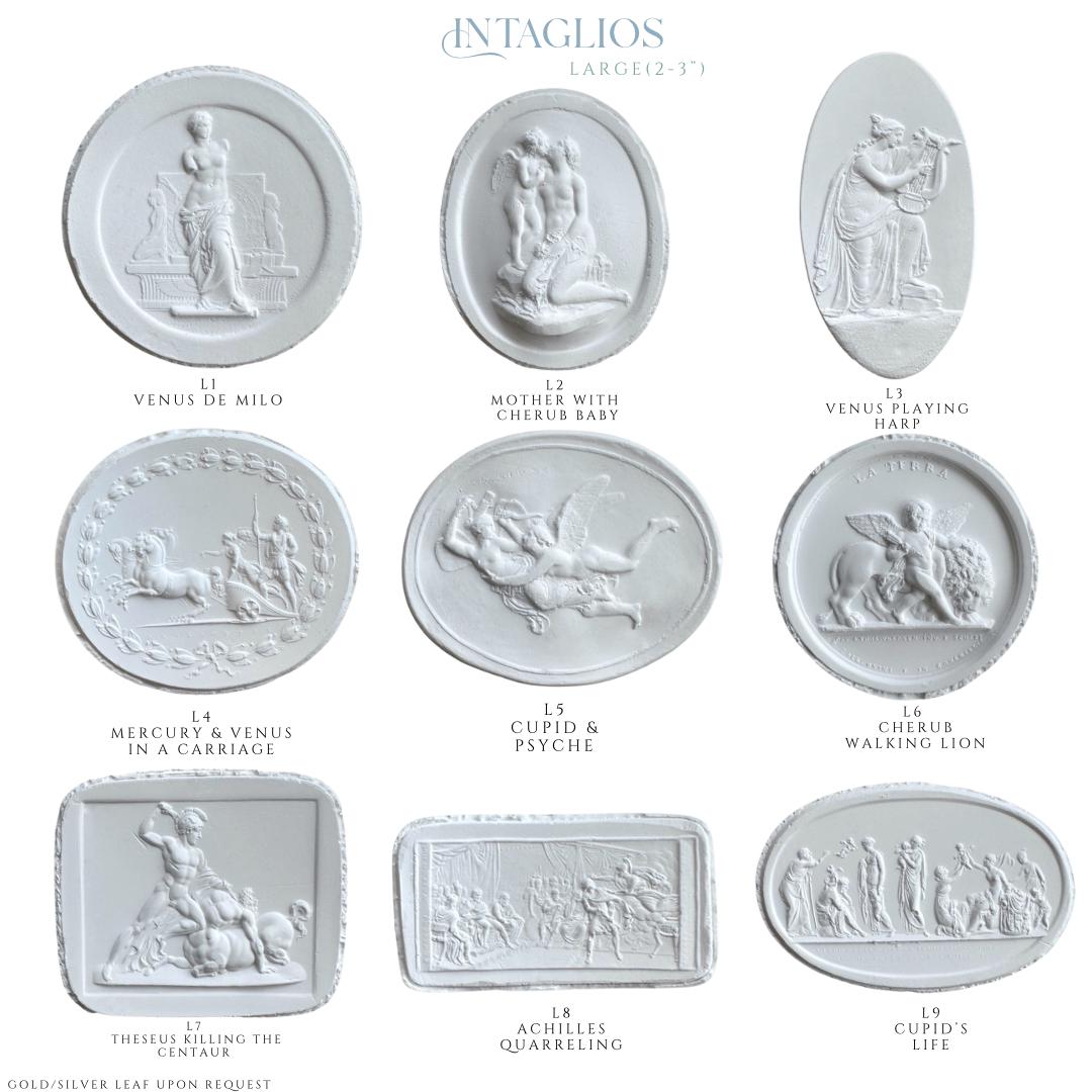 Our intaglios are made from high quality art plaster, therefore, each piece can slightly vary. Intaglio is an Italian word meaning "engrave." Intaglios were used to commemorate historical figures, architecture, and places. Before photography, people would collect Intaglios as keepsakes of their travels. During the 18th century, plaster intaglios became souvenirs for those embarking on the Grand Tour, a European journey emphasizing art and history.