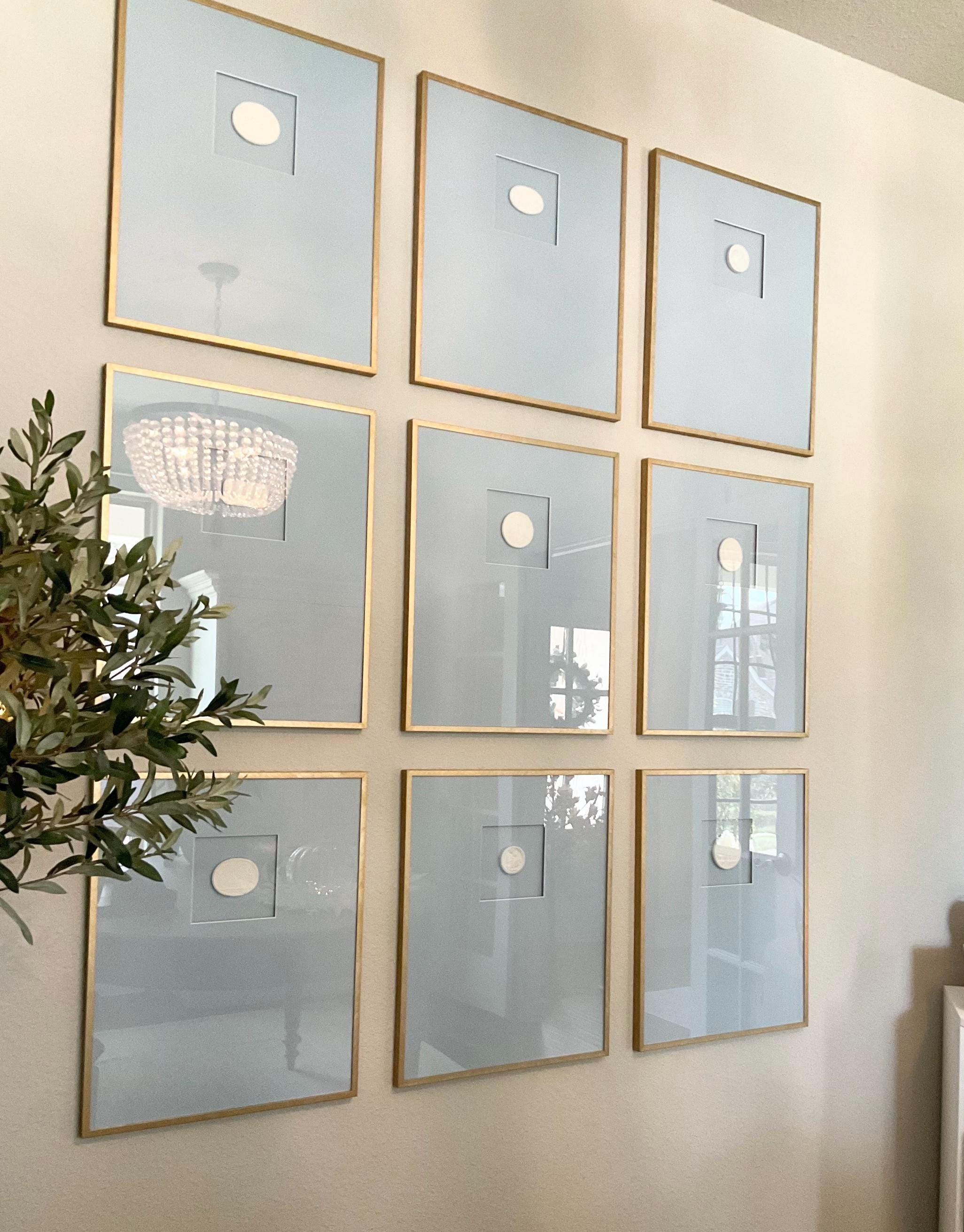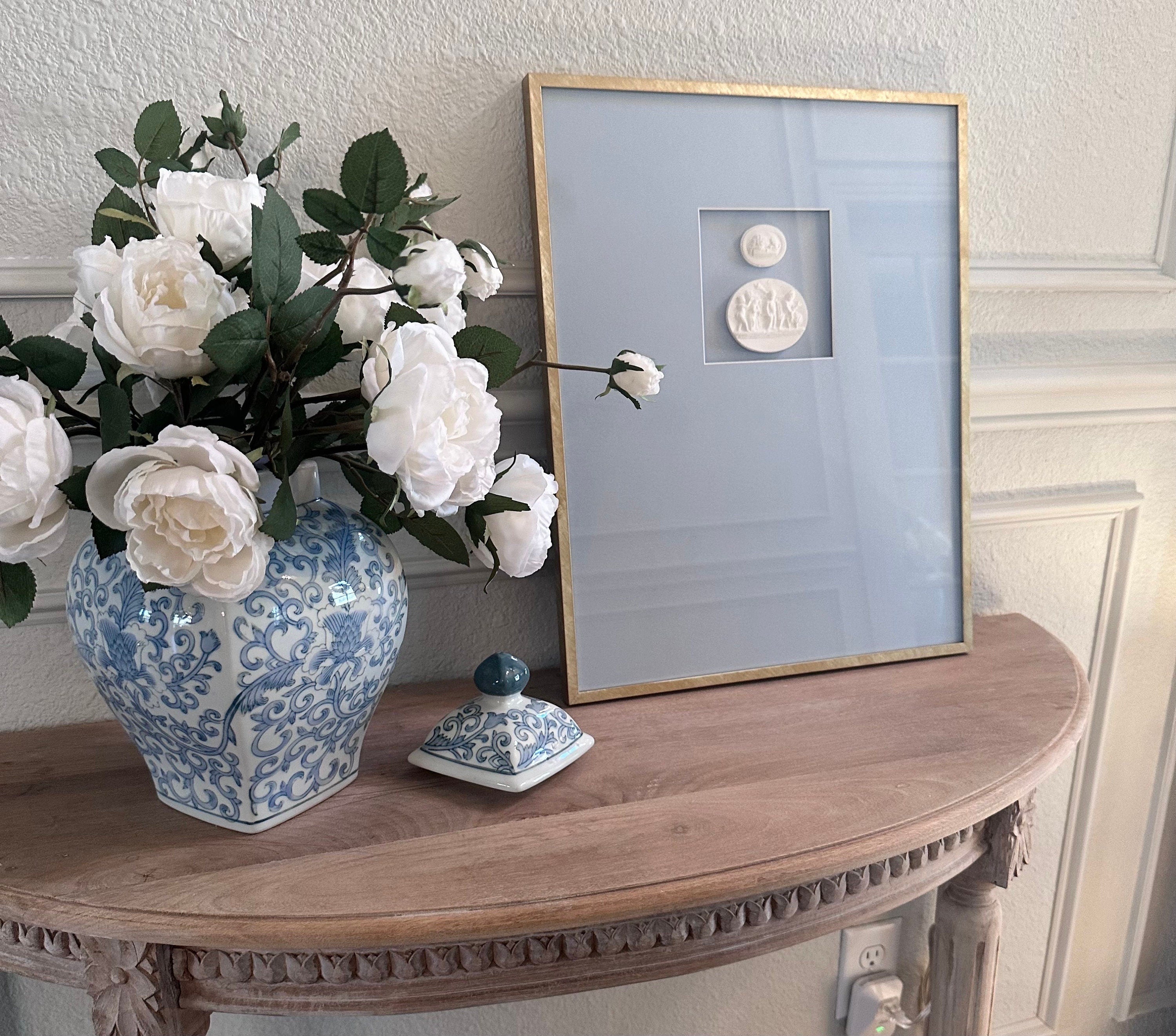 Gold metal 16x20 framed intaglio set on a beautiful powder blue background with a 5x5 mat opening (bottom weighted). Includes 1 intaglio inside the 5x5 mat but you can request doubles. This listing is for one frame but they look great grouped together in multiples! *Silver Leaf frame available upon request.