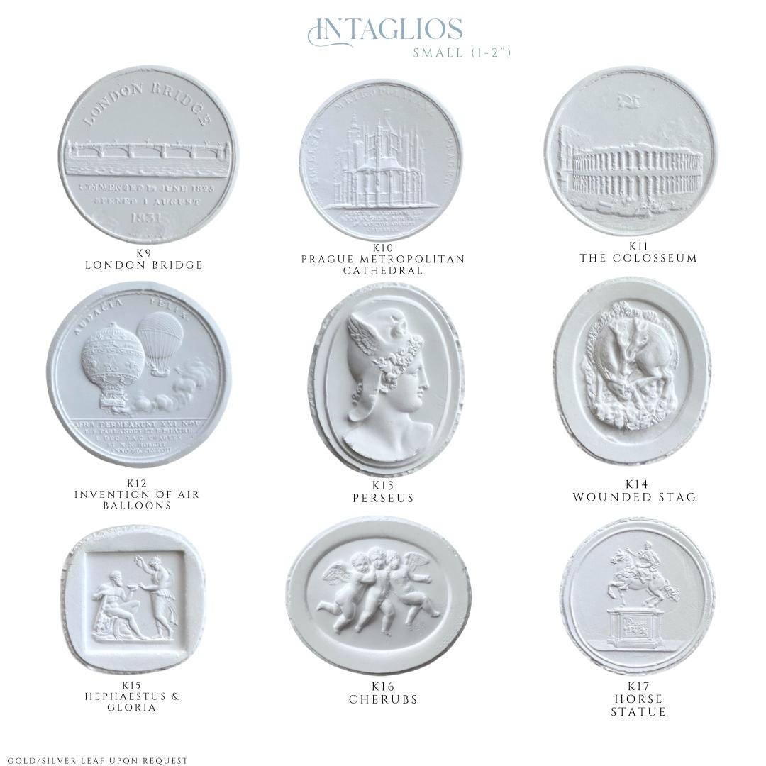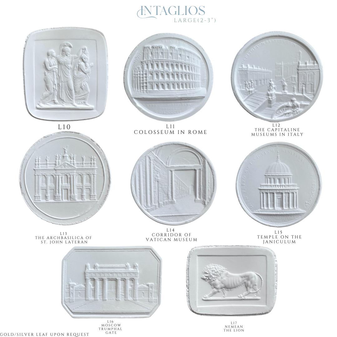 Our intaglios are made from high quality art plaster, therefore, each piece can slightly vary. Intaglio is an Italian word meaning "engrave." Intaglios were used to commemorate historical figures, architecture, and places. Before photography, people would collect Intaglios as keepsakes of their travels. During the 18th century, plaster intaglios became souvenirs for those embarking on the Grand Tour, a European journey emphasizing art and history.